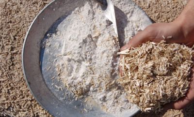 Une fois la chènevotte mélangée avec de la chaux (calcaire chauffé en poudre hydraté), un peu de pouzzolane (argile cuite en poudre) et de l'eau ont obtient le béton de chanvre.